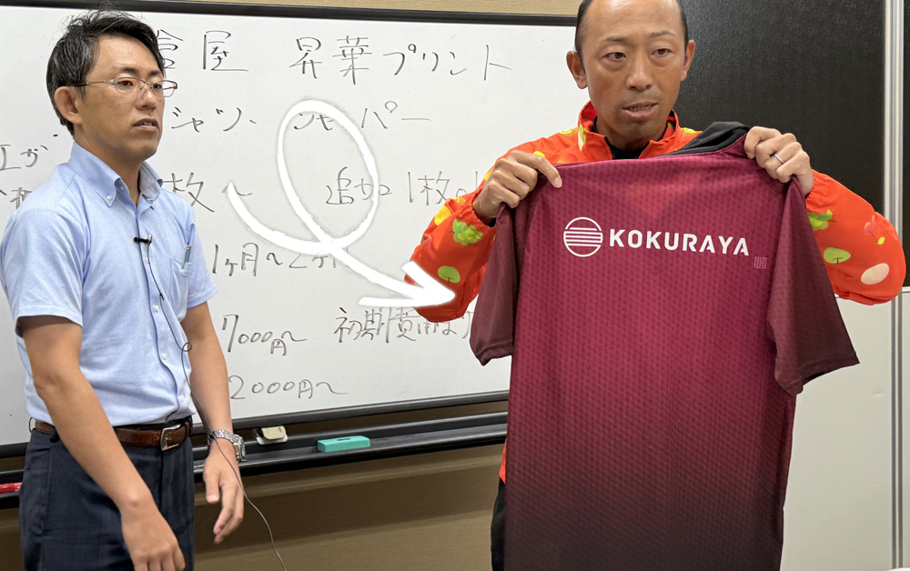 プリントと名乗っていますが、巨大なプリンターのような機械で白いポリエステル繊維にインクを染め付けているようなイメージなので、退色もほとんど感じない、スポーツだけではなく、ワークユニフォームとしてもとっても優秀な、差別化アイテムなのです!
