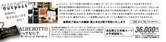 さて、今期も皆様お待ちかねの「秋冬物オーダースーツ採寸・受注会」を、静岡県富士市のエコフィールドにて開催いたします。